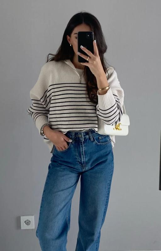 Дуже теплий та затишний смугастий светр-поло. Бірки з брендом та складом відсутні на жаль, але відчувається, що частково присутня й шерсть. Гарно сяде на М-L. Стан 10/10