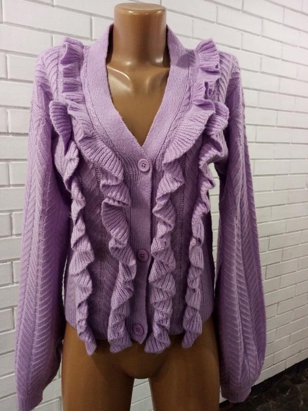 Свитер кардиган с милыми рюшами в размере 10, пуговки рабочие, состояние как новый, без малейших катышек. Очень красивый.