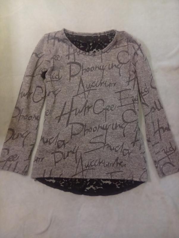 Женская кофта серого цвета с черным кружевом, зади спинка просвечивается сквозь кружево