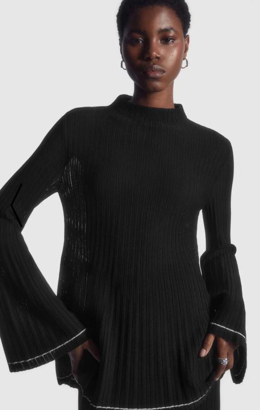 Стильный черный джемпер в рубчик от бренда COS, который имеет актуальный силуэт с высоким воротником-стойкой и эффектными расклешенными рукавами. Модель отличается лаконичным дизайном с контрастной белой полоской по нижнему краю и на манжетах, что добавляет образу графичность. Благодаря составу из вискозы и полиамида, изделие хорошо держит форму, приятное к телу и имеет легкий благородный блеск. Замеры: плечи- 40 пог- 52 рукав - 68 указан размер- M длина - 83