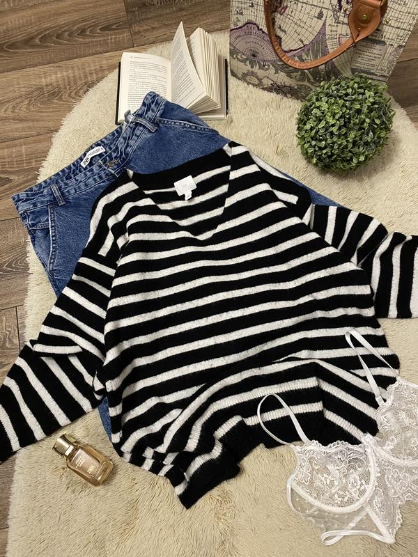 ❗️Кожна третя (найдешевша) річ у подарунок (1+1=3), за умов «оплати на картку»❗️Всі деталі в профілі «про мене»❗️ Светр оверсай розміром S, можна М, з V-подібним вирізом горловини з мʼякої тонкої вʼязки. Спущені плечі, довгі рукави та ребриста окантовка на вирізі горловини, манжетах та низу. Розрізи з боків низу. Довжина 69см., півобхват грудей 58см., низ 57см., довжина рукава від горловини 76см. В відмінному стані без дефектів.