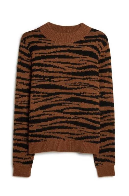 Свитер прямого кроя с тигровым принтом размером XXS, можно XS,S, состав хлопка с акрилом, плотной вязки, мягкий и теплый, длина 62см., полуобхват груди 48см., низ 46см., длина рукава от горловины 75см. Стан идеален.