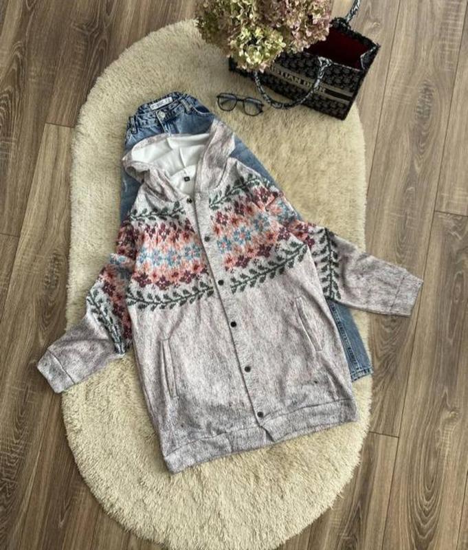 Удлиненный свитер на пуговицах с капюшоном размером XL, можно L, состав полиэстер, длина 78см, полуобхват груди 59см., низ 55см., длина рукава от горловины 76см. Стан идеален.
