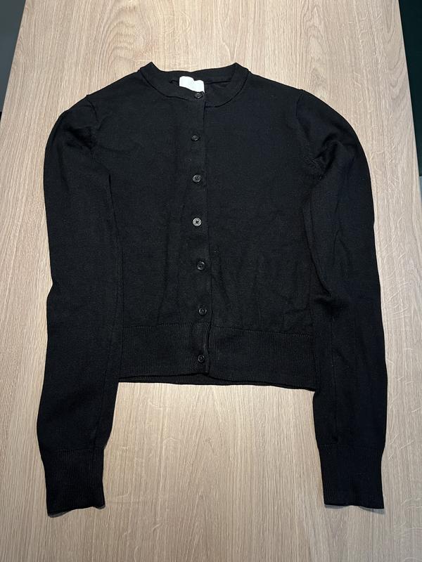 Жіночий укорочений кардиган H&M, чорний Продаю стильний чорний кардиган H&M. Укорочена модель, застібається на ґудзики, з довгими рукавами. Гарно поєднується з сукнями, джинсами та спідницями. Стан: б/в, хороший Є незначний недолік — надріз на внутрішній бірці (на носіння та зовнішній вигляд не впливає) Бренд: H&M Розмір: XS (EUR/US XS, 160/80A) Колір: чорний Матеріал: м’який трикотаж