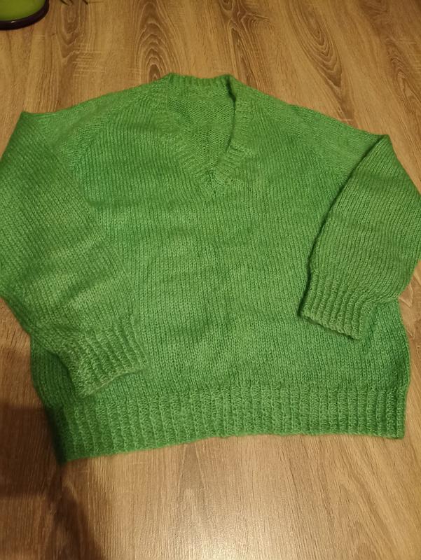 Яркий, светозеленый цвет, длина 70 см, рукав 45 см, полуобхват груди подмышками 59 см, полуобхват талии 56 см, полуобхват низа 49 см.