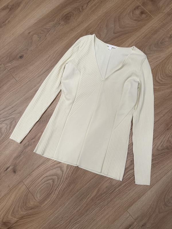 Гарний светрик кос. Молочного кольору. Рлзмір М дуже тягнеться. Бірки зі складом немає. Але думаю,це віскоза. Довжина 63см,пог 47