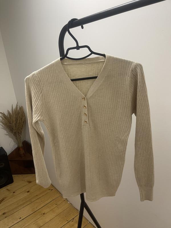 Новий светр з V-подібним вирізом у бежевому кольорі. Дуже приємна до тіла тканина та дуже мʼяка Хороша якість Розмір S/M, ще плюс добре тягнеться З приводу замірів звертайтесь в повідомлення