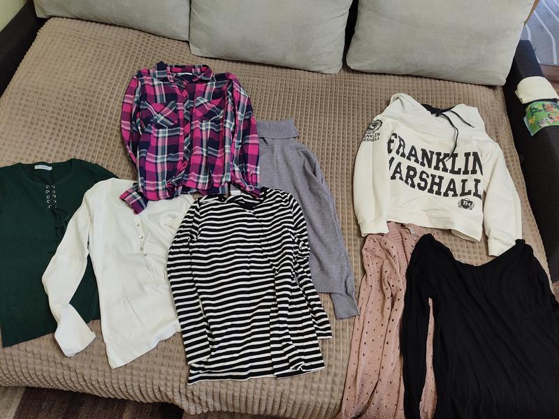 Пакет вещей, все в хорошем состоянии. Худи, рубашка, гольф, кофта в рубчик, лонгслив в полоска