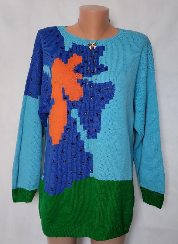 Классный удлиненный свитер вязаный ручная работа. Пряжа напоминает акрил, возможно, есть какой-то процент шерсти. Украшен пайетками. Замеры: длина 74 рукав от горловины 72 пог 57-71 пос 56-70 низ 52-62