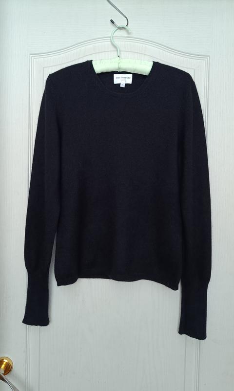 Вязаный тонкий свитер в черном цвете от Eric Bompard. Круглый вырез горловины, длинные рукава. Высокие манжеты (15,5 см) с разрезом посередине высотой 4 см. Манжеты, по желанию, можно отвести. Полуприталенный силуэт. Состав: 70% кашемир, 30% натуральный шелк. Очень мягкий и нежный, приятный к телу, не колется. Размер указан L. Маломерит. Лучше сядет на М. Ориентируйтесь на замеры: Ширина плечи - 37 см Полуобхват груди - 44 см Полуобхват талии - 39,5 см Ширина по низу (резинка без растяжения) - 42 см Длина по середине спинки - 57 см Длина рукава - 66 см, длина плеча - 12 см. Все замеры сделаны без растяжения, свитер тянется.