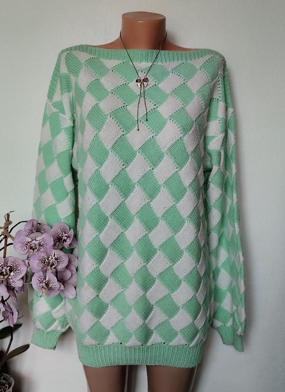 Бомбезный свитер джемпер нежного мятного и белого цвета. Похоже, что это ручная работа, но не могу утверждать. Тканина схожа на акрил. Размер не указан, смотрите замеры: длина 73 рукав от горловины 75 пог 54-74 пос 52-74 низ 40-60.
