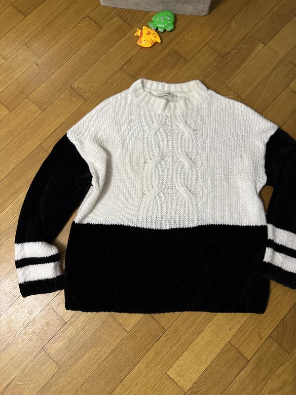 Вʼязаний светр чорно-білий Стильний вʼязаний светр з контрастним дизайном. Мʼякий, теплий, комфортний у носінні. Стан: дуже хороший Колір: білий / чорний Заміри: • Довжина — 63 см • Груди — 62 см • Рукав — 46 см Поєднання: джинси, штани, спідниці 📦 Висилка щодня