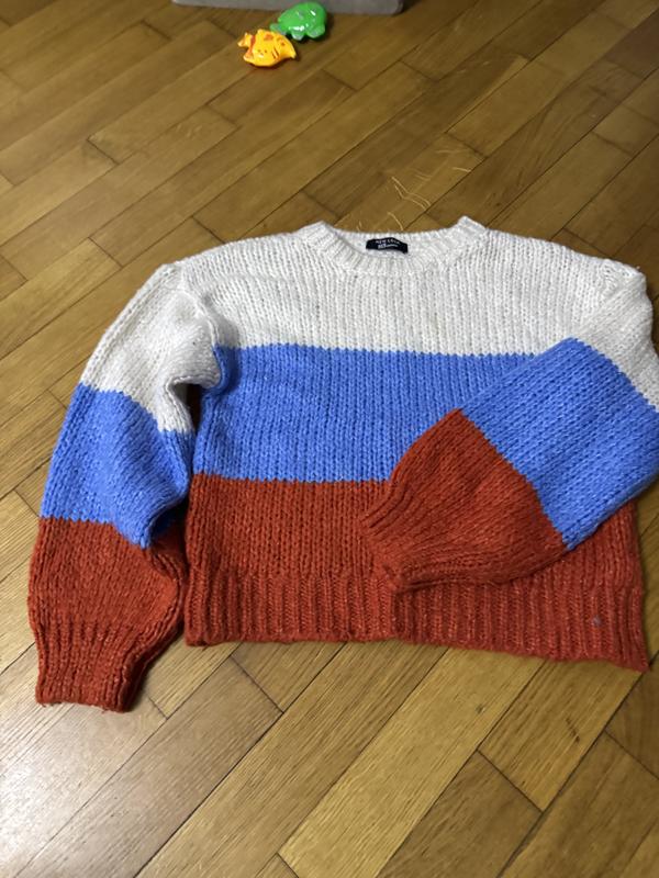 Вʼязаний светрик у смужку Стильний вʼязаний светрик з кольоровими смугами. Мʼякий, теплий та приємний до тіла. Виглядає яскраво, але легко поєднується з базовими речами. Чудовий варіант для повсякденних образів. Стан: дуже хороший Колір: молочний / блакитний / теракотовий Фасон: прямий Заміри: • Довжина — 54 см • Груди (півобхват) — 50 см • Рукав — 53 см З чим поєднувати: ▫️ джинси, mom/straight ▫️ спідниці, штани ▫️ кросівки, черевики 📦 Висилка щодня