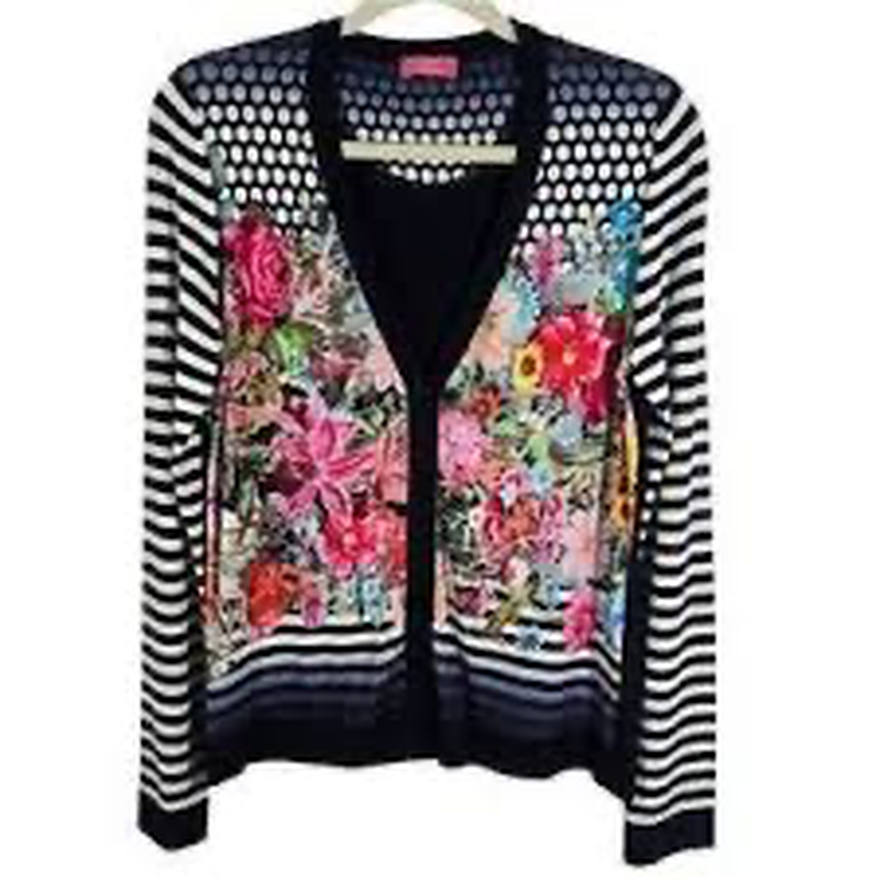 Стильный кардиган от премиального немецкого бренда Basler в отличном состоянии без катушек. Особенности: • Эффектное сочетание цветочного принта и полосатых рукавов • Основной цвет: темно-синий • Эластичный, хорошо тянущийся материал • Размер 46, подходит на 40-44 Замеры: • Длина: 70 см • Рукав от горловины: 77 см • Полуобхват груди: 53 см • Полуобхват талии: 50 см Идеально для создания ярких образов. Качество премиум класса от известного европейского производителя.