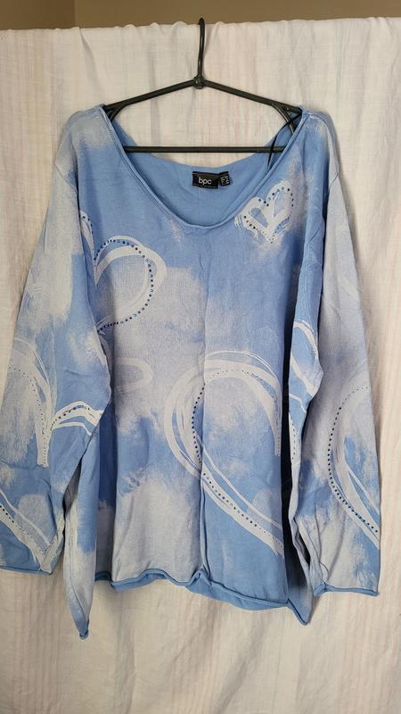 тонкий свитерок ровного силуэта, весь украшен синими камешками, ог и об 150+, рукав 69, длина 80.