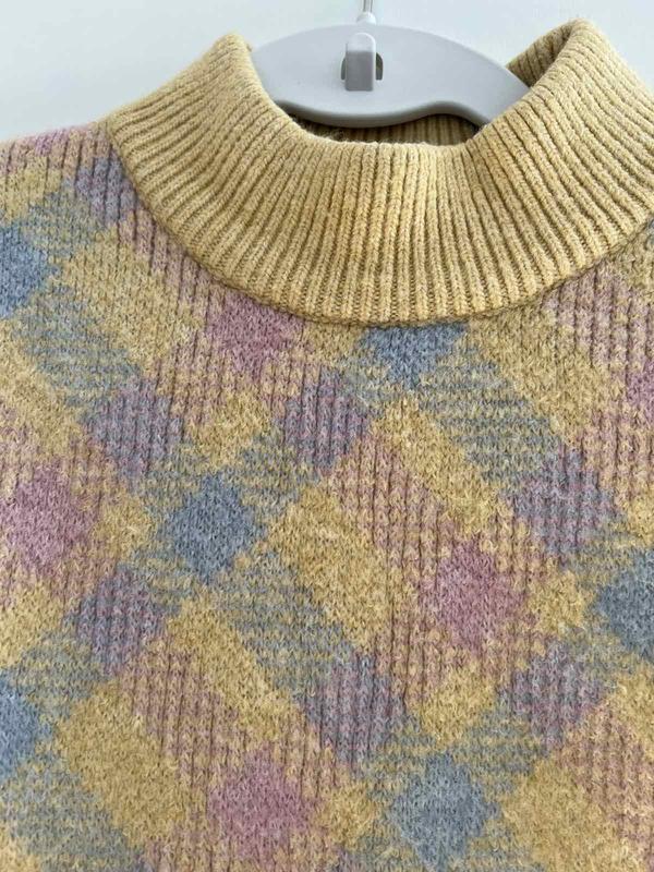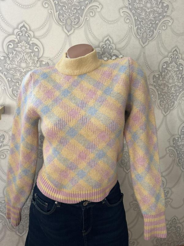 Очень красивый свитер,бежевого цвета в розово голубую клетку, нежного цвета.Очень теплый. Декор из бижутерии на правом плече. Состав ткани-54% полиэстер, 42% акрил, 4% шерсть 3%эластан. Об/ г.-90-92 см Об/т-68-70см Длина кофты-51 см Длина рукава-63см Сезон -осень, зима, весна. Дефектов не имеет(стан идеальный) Размер-S