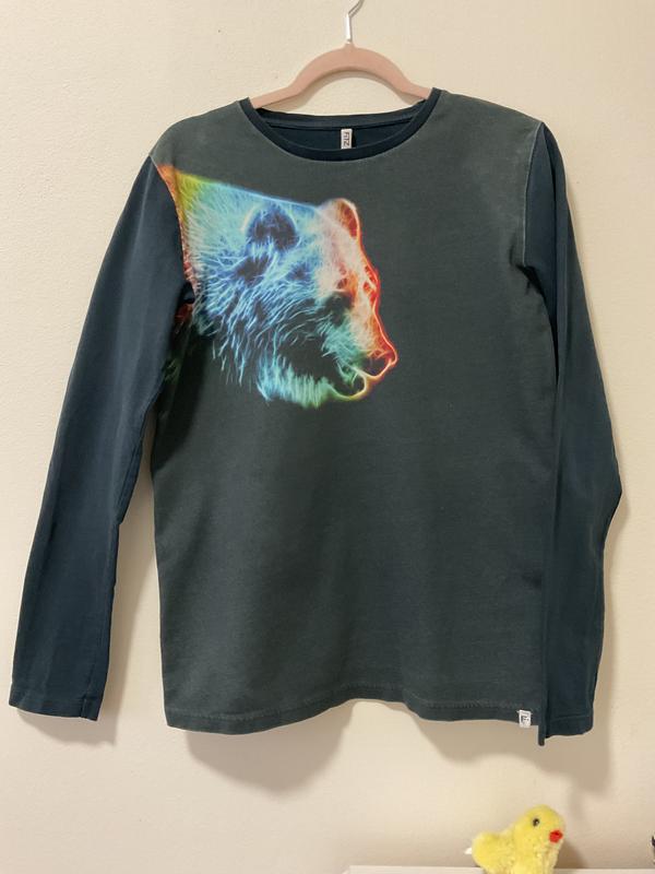 Лонгслив унисекс. Замеры: в плечах 42 см, между подмышками 50, длина 70. Рукав 65 см. Глубокий серый цвет, 100% хлопок. Интересный принт. Стан идеален.