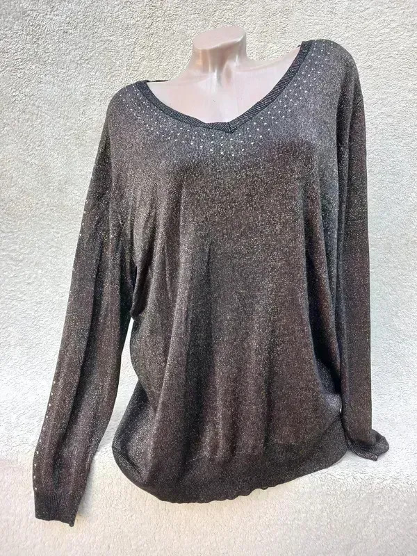 Тонкий нарядный свитерик с люриком, мягкий, не колется, становление новой вещи ПО груди 64-74, ПО низу 55-70, рукав 64, длина 76 Замеры отличий половина