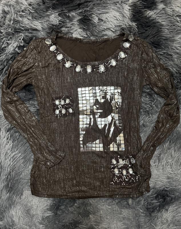 ✨ Ефектна кофта з дзеркальним принтом та кристалами Продам оригінальну жіночу кофту (лонгслів), яка точно не залишиться непоміченою! Поєднання глибокого шоколадного кольору, мерехтливої нитки та об'ємного декору створює яскравий образ у стилі Y2K / Glam Rock. 💎 Особливості дизайну: • Центральний елемент: Стилізоване зображення, викладене з "дзеркальних" квадратів, що круто відбивають світло. • Декор: Горловина та окремі зони прикрашені великими прозорими кристалами та сріблястими паєтками. • Тканина: Матеріал має делікатне металізоване напилення (люрекс), що створює ефект легкого сяйва по всій поверхні. 🧵 Характеристики: • Склад: 65% поліестер, 35% бавовна (тканина приємна до тіла, гарно тягнеться). • Колір: Темно-коричневий (шоколадний) з графітовим відблиском. • Стан: Відмінний, усі елементи декору на місці. • Фасон: Приталений крій, довгий рукав, округлий виріз. . Всі бірки на фото, фото на собі не роблю . Розмір універсальний 42-46 універсальний 💌 Пишіть у приватні повідомлення, відповім на всі питання!