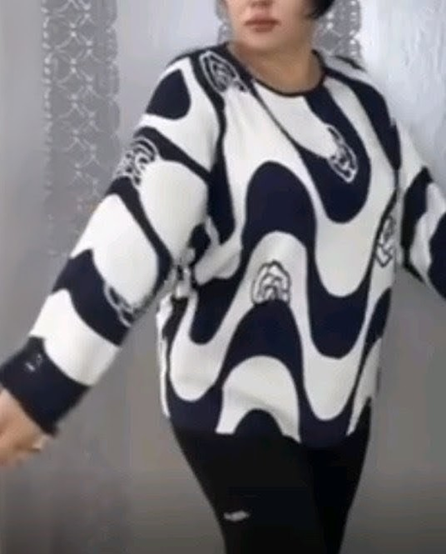 Теплый свитер шерсть+коттон, черно-белая расцветка. Рукав 3/4 ни зауженный. По низу рукава черная подвернутая манжетка с декором-гудзик. Фасон кроя "летучая мышь", прямой, низ свитера ни зауженный. Очень эффектно смотрится. Размер один, пойдет на 54-56. Ширина-60см, длина-62см. Пересылаю после оплаты на карточку или безопасной оплатой.