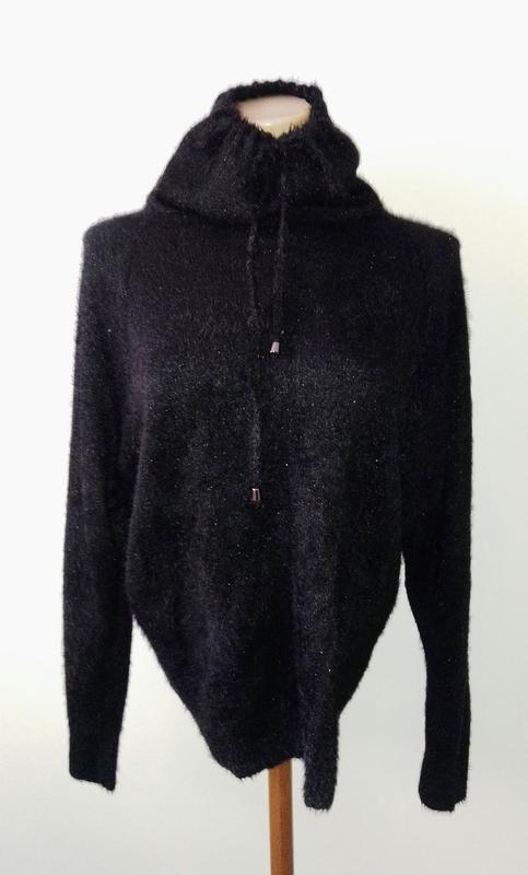 Эффектный свитер, рукав реглан, рукав сверху достаточно расширен. Интересно выполненный ворот: высокий, сверху стягивается на шнуровке, которая выполнена из такого же трикотажа, как свитер. Состав: мягкий, очень приятный трикотаж - травка, полиэстер. Цвет насыщено черный, изнутри при вечернем освещении пробивается блеск нейлона. Дефектов нет.