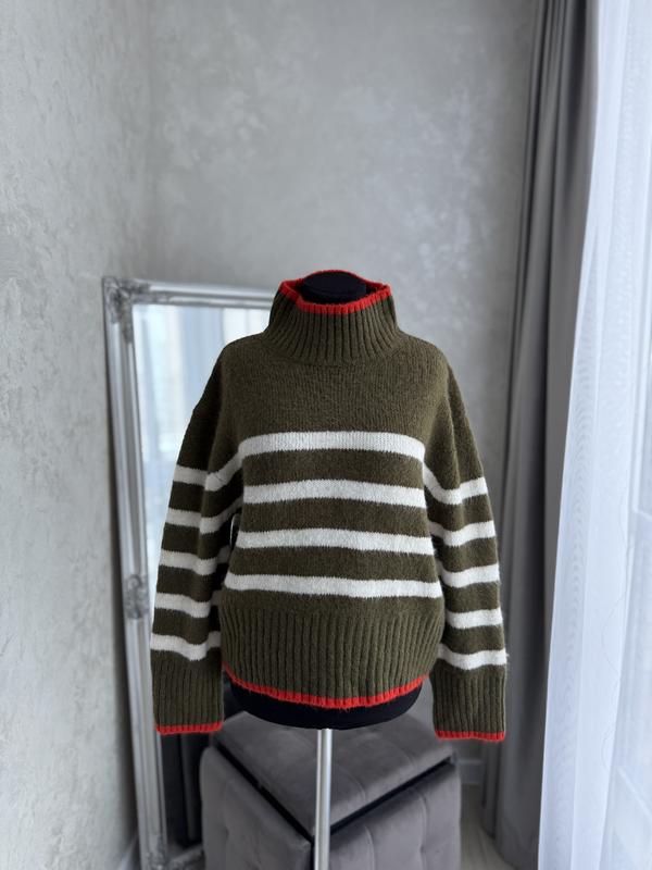 Стильний светр в полосочку, під шийку, 100% поліестр, але бірочка відсутня❤️ Стан ідеальний Рр С-М, Заміри: Плечі піб 49 см Під пахвами піб 56 см Рукав від плеча 50 см Довжина 52 см