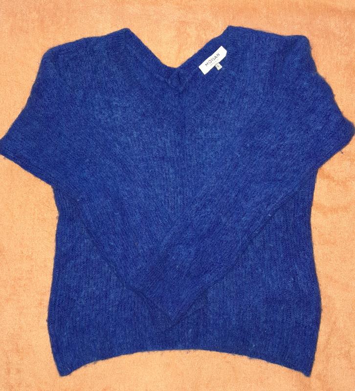 Теплый женский пушистый свитерик классического синего цвета Воротник треугольником Замеры на фото