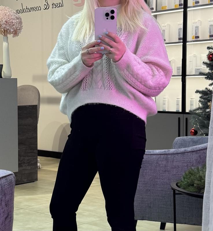 Светр укорочений, дуже стильний, такий як на фото , стан дуже хороший, рукав широкий , в низу завужений, розмір оверсайз