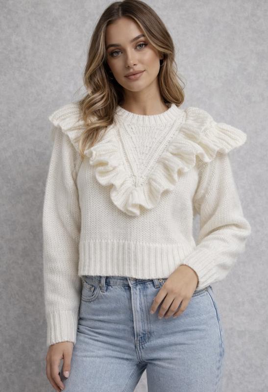 Молочний в'язаний светр In The Style з акцентними рюшами. * Модель укорочена, вільного крою * Обʼємні рюші по плечах і грудях у V-формі * Довгі рукави з манжетами * Щільна, мʼяка вʼязка #| Колір - айворі / молочний