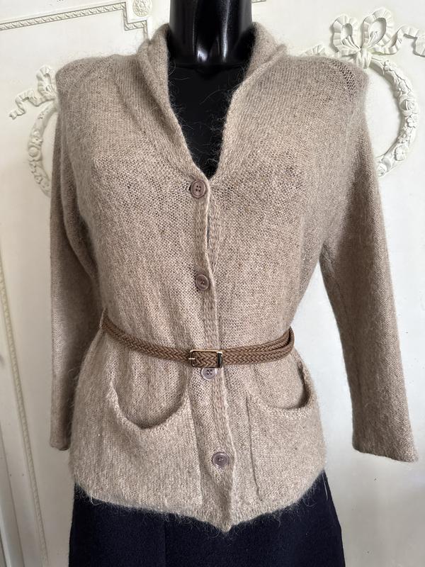 Mayerline (або Mayerline Brussels) — це бельгійський модний бренд преміум-класу, заснований у 1957 році. Компанія спеціалізується на створенні елегантного та позачасового жіночого одягу, роблячи особливий акцент на ідеальній посадці та високій якості матеріалів. Кардиган бежевого кольору на ґудзиках. Два кармани. Склад:мохер/нейлон(60/40). Розмір по бірці-L. Заміри: довжина-60 см, ПОГ-46 см, ПОТ-41 см, ПОБ-46 см, рукав-60 см. По талії є шльовки доя пояса(пояс в комплекті відсутній). На фото приклад з поясом. Стан ідеальний. По всьому виробу де-не-де нашиті маленькі паєтки в тон ниток.