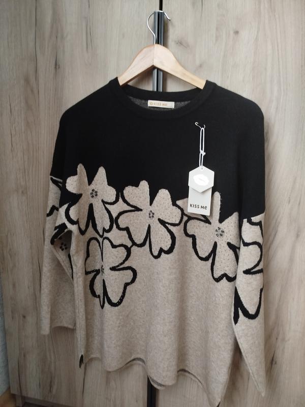 Бежево-черный «KISS ME» Новый свитер с цветами и люрексом Мягкий, двухцветный джемпер. Цветы с деликатным мерцанием. Свободный крой, приятный к телу. ПОГ 58 Рукав от шеи 65 Длина 69 Новый (с биркой).500 грн Стиль: Casual, нарядный. 2. Малиновый с объемным декором Яркий свитер с 3D цветком Насыщенный цвет фуксии. Акцентный объемный цветок на плече и рукаве. Модний фасон оверсайз. ПОГ 56 Рукав от шеи 70 Длина 68 Новый (с биркой).450 грн Стиль.Акцентный, современный. 3. Черный со стразами (An Peiya) Элегантный черный джемпер в рубчик Классическая модель с вертикальными линиями из страз (визуально стройнит) качественная вязка. ПОГ 56 Рукав от шеи 69 ПОБ 64 Длина 75 Низ скруглен. Состояние: Новый (с биркой).400 грн Материалы:кашемир,котон, спандекс,полиэстер. Кофточки можно брать от 48 до 52 размера. Плюс Комисцией, если олхдоставкой.