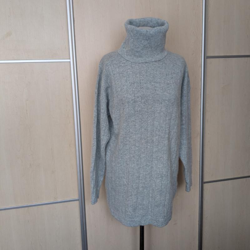 без недостатков цвет: серо голубой состав: 70% шерсть, 20% ангора, 10% нейлон размер: L,(один раз ориентируйтесь на замеры) замеры: длина: 73 полуобъем груди: 54 ширина плеч: 40 длина рукава: 59, от шеи 72 низ: 54, тянется до 60 мах. высота воротника: 29