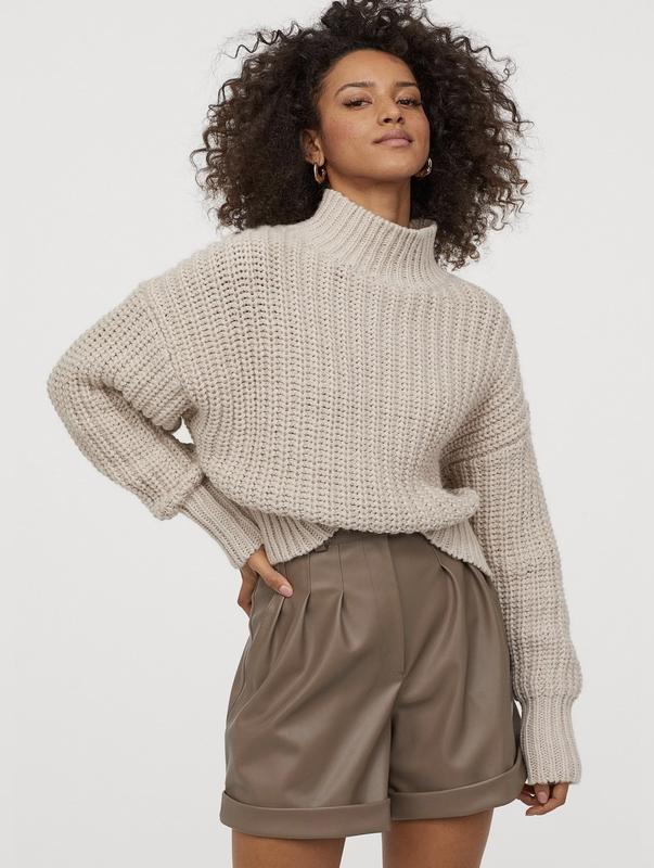 xs грудь 55 талия 42 длина 45 рука от шеи 6 Джемпер крупной вязки из мягкой пряжи с добавлением шерсти. Рельефный ворот, сильно заниженная линия плеча и длинные рукава. Рельефная резинка снизу на рукавах и по нижнему краю. Полиэстер в составе джемпера - переработанный.