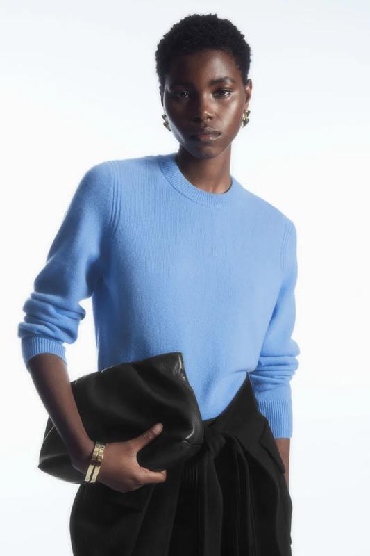 Вневременной вязаный свитер в голубом цвете от COS. Имеет круглый вырез горловины, ребристую отделку горловины, манжетов рукавов и низа свитера.Стандартный прямой крой. Состав: 100% сертифицированный кашемир. Мягкий, нежный, теплый, приятный на ощупь. Средней плотности. Размер указанный S. Обратите внимание на замеры: Ширина плечи - 38 см Полуобхват груди - 48,5 см Ширина по низу (резинка без растяжения) - 44 см Длина по середине спинки - 59 см Длина рукава - 62 см, длина плеча - 15 см Все замеры сделаны без растяжения, свитер тянется.