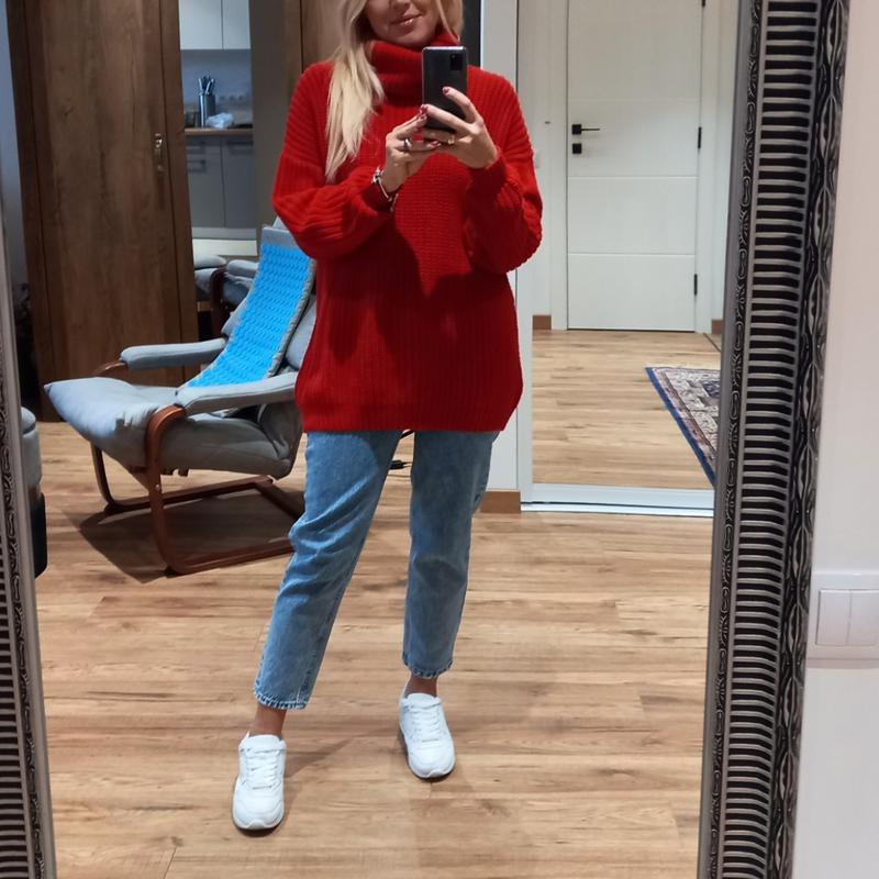 60% хлопок, красный, размер М, хорошей вязки длина 70см ПОГ 58 рукав от горла 74см
