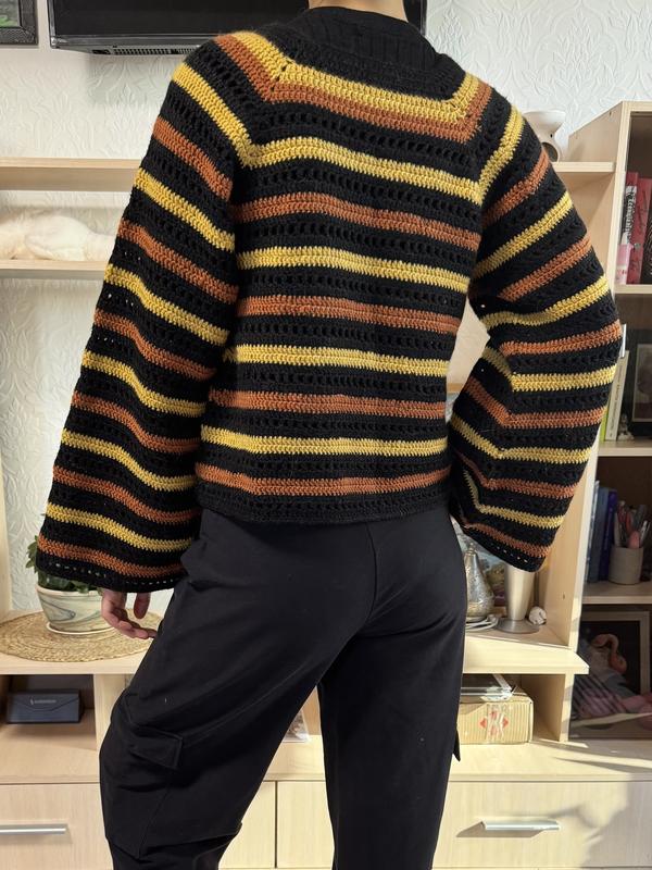 1+1=3❣️ Унікальний светр ручної роботи з яскравими смугами • Розмір: S-M • Кольори: чорний, жовтий, теракотовий • Матеріал: акрилова нитка • Техніка: в'язання без швів • Стан: новий • Ручна робота Стильний светр з контрастними горизонтальними смугами. Ідеально підходить для створення яскравих осінніх образів Заміри уточнюйте