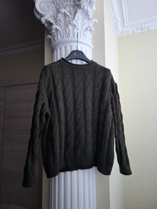 Свитер вязаный косами в невероятно красивом зеленом цвете. Стан идеальный, размер М. Ткань приятная на ощупь, усложнение 5% шерсти.