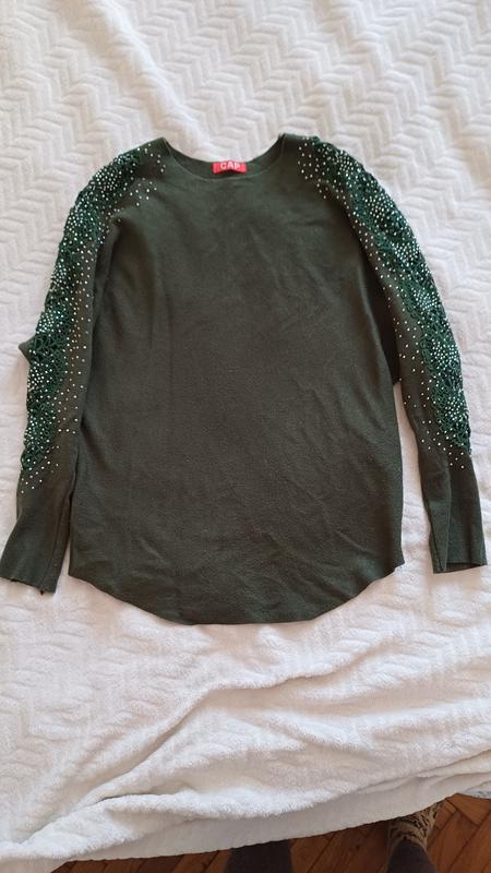 Стильная кофта глубокого оливково-зеленого цвета. Модель с округлым вырезом горловины и плавно закругленным низом, красиво садится по фигуре. Рукава декорированы эффектными вставками из прозрачной сетки с объемной вышивкой и мелким блестящим декором, который добавляет образу праздничности и утонченности. Манжеты приталены. Ткань мягкая и приятная к телу, хорошо тянется. 📏 Длина изделия - 61 см 📏 Длина рукава от выреза - 64 см