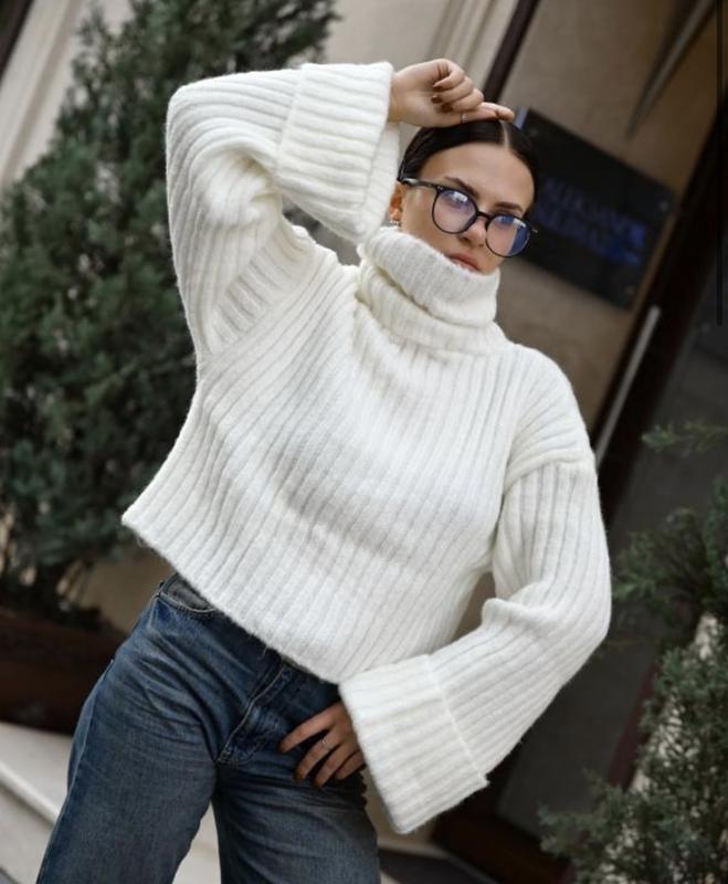 Склад: 10% вовна, 10% віскоза, 80% поліестер М’яка сумішевий пряжа дарує відчуття тепла і ніжності, не викликає подразнень і не колеться. Тканина дихаюча, тримає форму і стійка до катишків. Опис: Светр Aurora — це втілення затишку і легкості. Об'ємна в'язка, укорочений крій і акцентні широкі рукава створюють сучасний силует у стилі soft minimalism. Високий комір захищає від холоду і надає образу елегантності. Ідеально поєднується з джинсами, спідницями і пальто oversize. Деталі: Об'ємний комір-гольф Широкі рукава з щільним манжетом М’яка еластична резинка по низу Укорочена довжина Розмір (см): ПлечіГрудьРукавДовжина55504644Переваги: М’який, затишний і теплий Універсальний фасон — підходить під будь-який стиль Сучасний крій з акцентом на об'єм Не втрачає форму і колір після прання