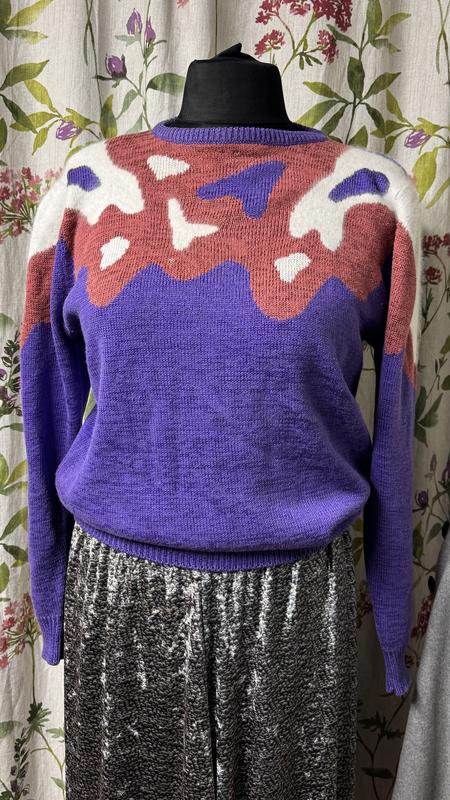 Неймовірно гарний светр із красивим поєднанням кольорів - фіолетовим, молочним в коралово-кірпічним. Малюнок дуже його оживляє. Склад зазначений на фото, до тіла приємний. Розмір не вказаний, добре сяде на 12-14 британський. Рукав зі зборками (ліхтарик). Заміри: Довжина виробу 62 см ПОГ 53 см ПО низу 44 см Довжина рукава 59 см Ширина плечей 42 см Стан в цілому ідеальний, але є один брак на кораловій частині відсутня фарба - див останнє фото.