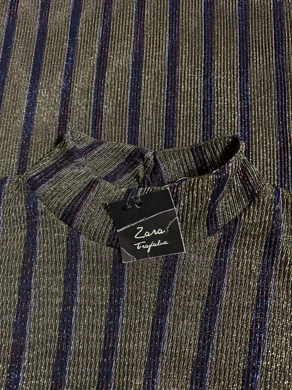 В наявності гарна кофточка фірми ZARA. Розмір вказаний mex 28, за замірами йде на 18-22. Склад: 81% поліестер і 19% блискуча нитка, тканина добре тягнеться. Тканина дуже гарно переливається на світлі. ПОГ-66 і ще тягнеться, довжина спереду-68, ззаду-73, плечі приспущені-56, довжина рукава-57, ширина по низу-60 і ще добре тягнеться.