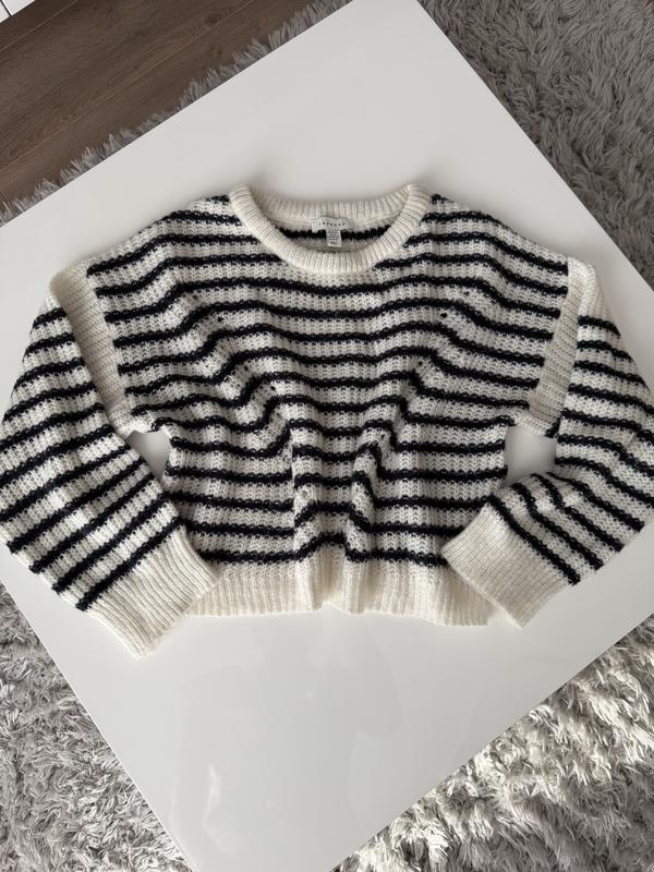 Класний светрик TopShop в актуальну смужку. Ажурна вʼязка, приспущене плече, вільний по грядах. Сідає дуже красиво! Розмір XS - M невелика. Заміри: по грудях 53 см, довжина 46 см