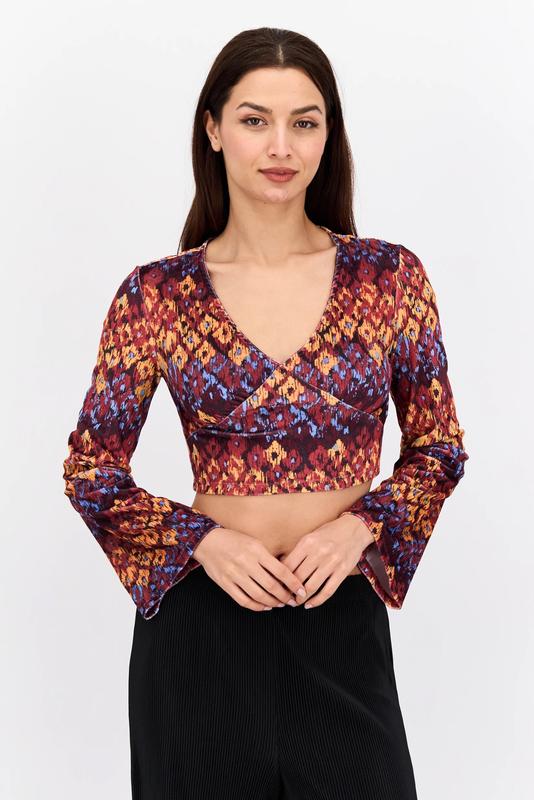 ✨ Ефектний кроп-топ Sinsay з розкльошеними рукавами Продаю новий кроп-топ від бренду Sinsay із трендовим принтом. Дуже стильна модель, яка ідеально підкреслює фігуру завдяки продуманому крою та еластичній тканині. 💎 Основні характеристики: • Бренд: Sinsay (оригінал, з біркою). • Розмір: M (підійде на S-M завдяки еластичності). • Колір: Насичений абстрактний принт у теплих теракотових, жовтих та блакитних відтінках. • Тканина: М’яка, приємна до тіла, з легким велюровим/оксамитовим відливом (дуже гарно переливається на світлі). • Стан: Новий, з усіма магазинними етикетками. 🔥 Особливості фасону: • V-подібний виріз з ефектом «за́паху», що гарно підкреслює зону декольте. • Рукави кльош: Широкі рукави додають образу легкості та ретро-нотки (стиль 70-х). • Довжина: Кроп (вкорочений), ідеально поєднується з джинсами на високій посадці, спідницями або штанами-палаццо. Всі бірки на фото, фото на собі не роблю. Для замовлення пишіть в приватні повідомлення❤️