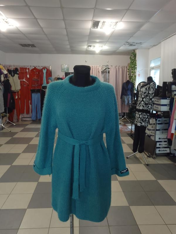 Длина свитера 84 см, длина рукава 58 см, ПОГ 55 см, ПОБ 57 см, пояс в комплекте, можно носить как оверсайз или под пояс