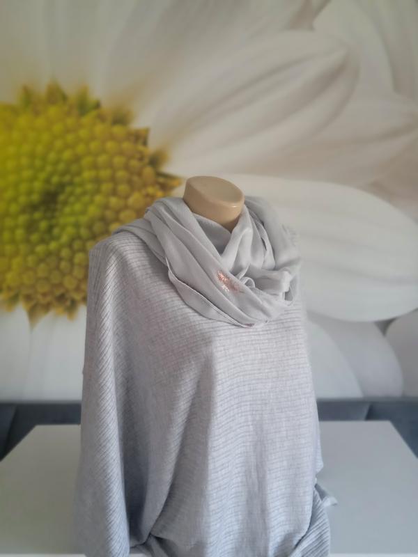 Классическая однотонная кофтонка с коротким рукавом светло серого цвета. Легкая и удобная. Приятная на ощупь. Фактурная машинная вязка в горизонтальную полоску. Нить средней толщины. Стрейч. Ложится свободно. Фасон-летюча миш. Аккуратный вырез Стильно смотрится с шарфом в тон в комплекте (шарф может быть заменен, но в цвете). Есть размеры. 56р на пог-60-62 54р на пог-58-60 52р на пог-56-58