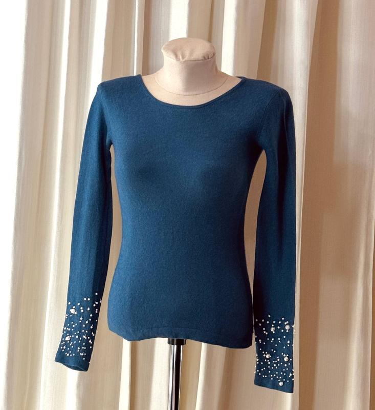 Светер жіночий синій H&M🛍️❤️🔥 Розмір - UK 6-8/ EUR 34-36/ USA 2-4/ XS-S / 42-44. Склад : 50% вовна, 50% кашемір. Виробник Бангладеш. Светер приталеного крою з середньою щільністю, рукав декоровано перлинами. Додаткові заміри: повна довжина 57 см, ширина плечей 36 см, довжина рукава 61 см, напівобхват грудей 36 см (повний обхват 72 см) і тягнеться до 90 см, напівобхват талії 34 см (повний обхват 68 см) і тягнеться до 86 см, напівобхват стегон 40 см (повний обхват 80 см) і тягнеться до 106 см.