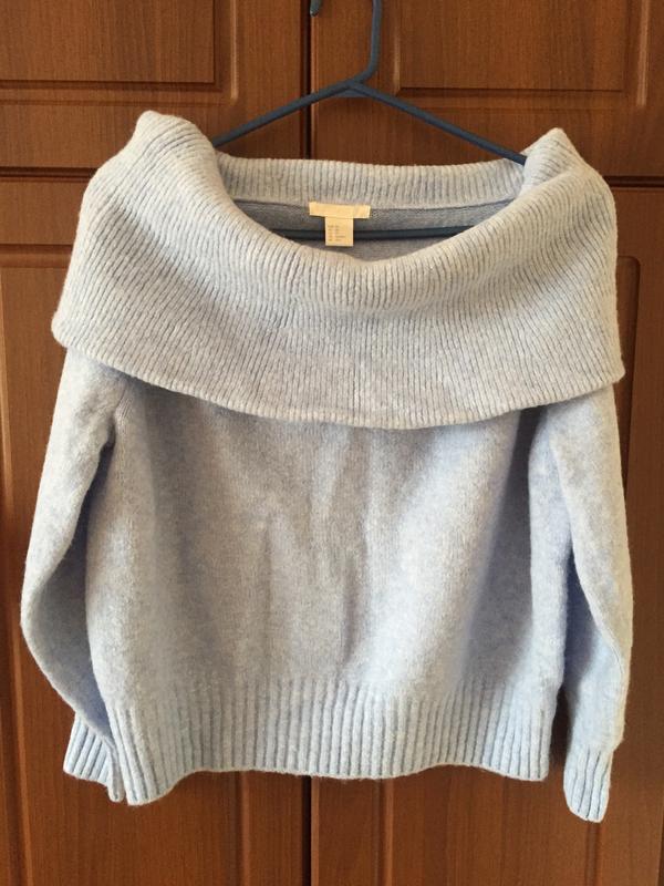 Светр дуже ніжного голубого кольору( фото погано передає відтінок) Широка горловина, можна по різному імпровізувати як носити светрик Розмір xs, але на s теж буде добрий. Стан ідеальний
