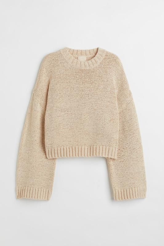 Укорочений в'язаний светр з м'якої акрилової пряжі бренду h&m. Новий, без паперової бирки. Розмір S. Вільний крій, занижена лінія плеча, довгі широкі рукави. Рельєфна окантовка навколо горловини, манжет і по нижньому краю. Позаду має виїмку, що робить спинку коротшою за перед. Склад: 68% акрил, 32% поліамід.