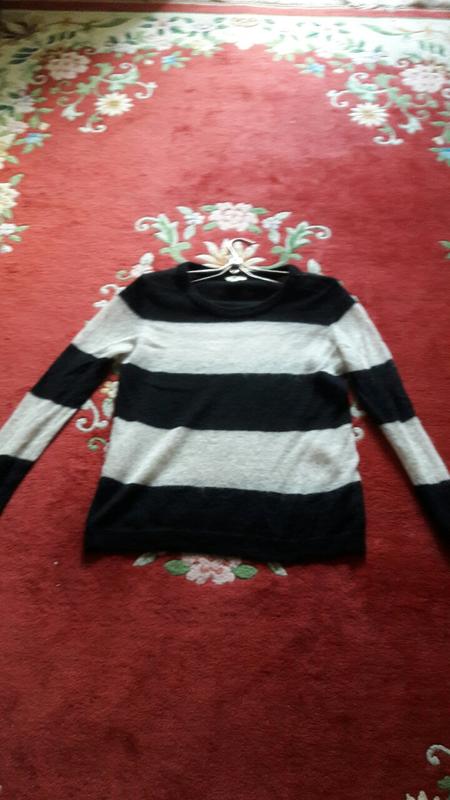 симпатичный свитерок.На этикетке указан размер S,смотрите по замерам,идет немного больше.Состав-50мохер,30поамид,20 шерсть.Замеры в спокойном состоянии-плечи 42-43,грудь 53,охват рукава под простой 30,длина рукава 66,длина свитра 70.Очень воздушный и теплый,не кусается.Сзади ближе к низу имеется одна деформированная петля,на состояние не влияет,можно подтянуть.Видно на фото