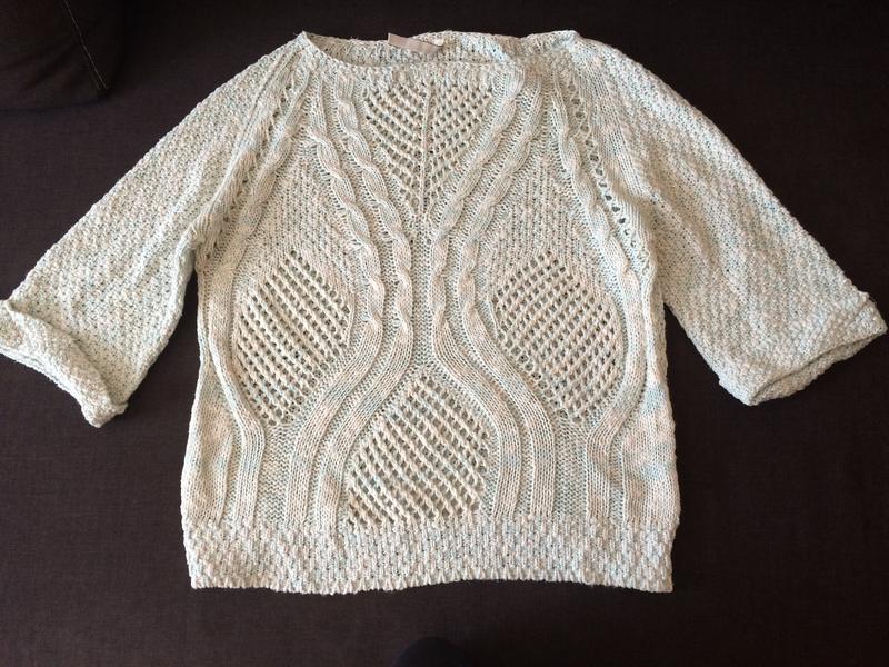 Отличный очень мягенький свитерок оверсайз, рукав 3/4, цвет меланж молочный с мятным, фото так цвет не передает, в жизни он ярче! Заинтерисованным попробую сделать фото проф. фотоапаратом и переслать на почту. покупала на Модной касте, надевала всего несколько раз, очень класно смотрится с джинсами и брюками скинни! Замеры Длина 58 см, ширина 49 см, длина рукава от горловины 46 см